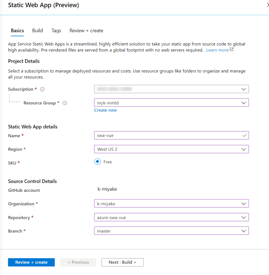 Open the Azure portal and go to "Create a resource", and search "static web apps". Fill in all the necessary information as follows. In this process, you link this resource with the GitHub Repo.