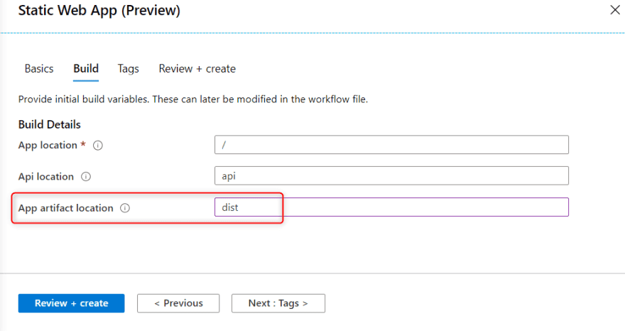 Click "Next:Build", and it takes you to the next step. In this step, type "dist" for "App artifact location". "dist" is a directory that outputs the static files for hosting, such as HTML, CSS, Javascript when we run npm run build (standard build command of Vue CLI).