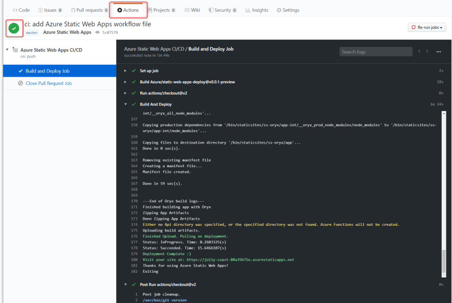 At this point, the build workflow of GitHub Actions runs automatically in the background. To check the build status, you can open the Actions tab in GitHub. If the Icon is green, then the build and deploy are successfully completed.