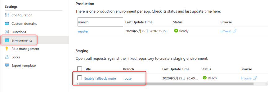Here, The pull request is triggered and the deployment to Static Web Apps is executed. Once the build process is completed, you can confirm the deployed change under "Environments" in Azure Portal.